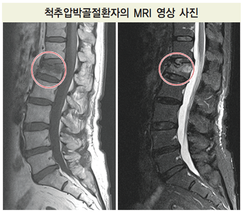 진단은 먼저 엑스레이를 찍어 척추체에 압박이 있는지 확인한다. 그리고 MRI를 찍어서 압박골절이 급성인지, 아급성인지, 만성인지 감별해야 한다.