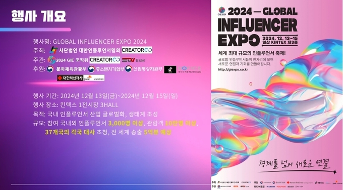 2024년 12월 13일부터 15일까지 킨텍스에서 개최되는 '2024 글로벌 인플루언서 엑스포(GIE2024)'는 글로벌 인플루언서와 브랜드가 함께 모여 혁신적인 제품을 선보이고, 네트워킹 기회를 제공하는 자리로 마련된다.