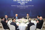 이재명 대통령이 29일 경북 경주 힐튼호텔 그랜드볼룸에서 열린 이 대통령 주최 정상 특별만찬에서 환영사를 하고 있다. 이재명 대통령 오른쪽 시계방향으로 르엉 끄엉 베트남 국가주석, 크리스토퍼 럭슨 뉴질랜드 총리, 마크 카니 캐나다 총리, 아누틴 찬위라꾼 태국 총리, 로런스 웡 싱가포르 총리, 앤서니 앨버니지 호주 총리. 도널드 트럼프 미국 대통령.