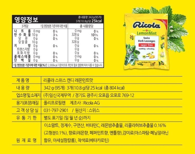 '리콜라(Ricola)'는 스위스에서 만들고 일신국제무역이라는 회사에서 수입하는 사탕이다.