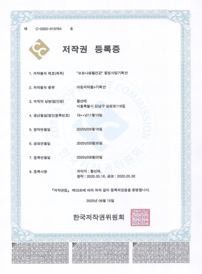 "코로나생활건강" 국내최초 저작권 등록