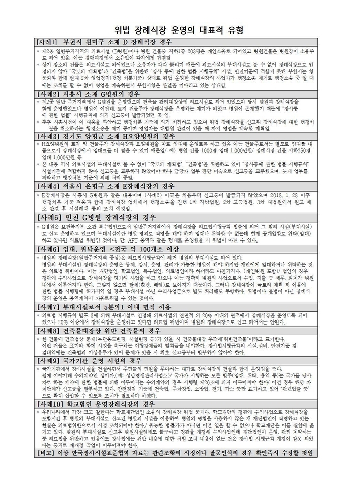 한편, 최근 대형 요양병원들이 그 시설을 이용하는 당사자들의 임종시 장례를 위해 허용한 부속 장례식장을 민간인들에게 무단 임대하고 있다는 사실도 심각한 사안이다. 또 150개소에 달하는 위법 사항 중 상당수가 건축법을 위반하고 있다.
