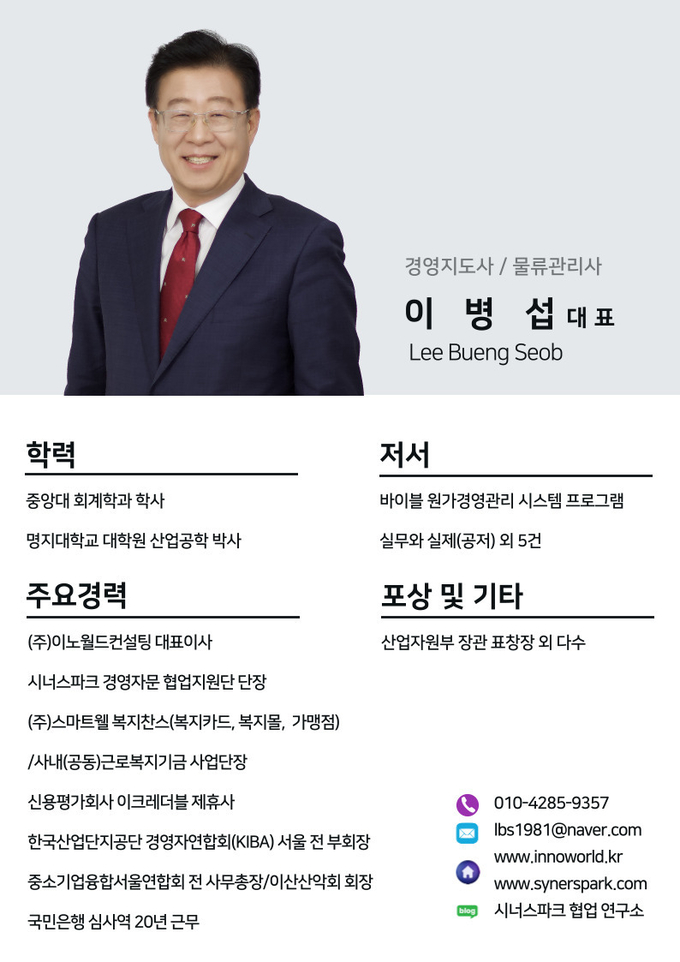 문의: 이병섭 대표이사 (주)이노월드컨설팅 / 경영지도사 / 물류관리사 / 산업공학박사 / 시너스파크 경영자문 협업지원단 단장 / 마켓허브 파트너 / (전) 국민은행 심사역