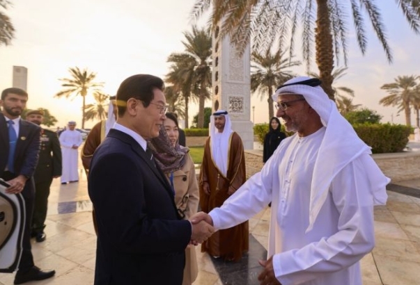 이재명 대통령은 18일(현지시간) 아랍에미리트연합국(UAE) 대통령궁에서 모하메드 빈 자이드 알 나흐얀 대통령과 만났다고 김남준 대변인이 밝혔다.
