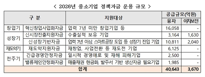 중소벤처기업부는 22일 '2026년 중소기업 정책자금 운용계획'을 발표하고, 중소기업의 혁신성장 촉진과 금융안정 지원을 위해 정책자금 공급 규모를 전년 대비 확대한다고 밝혔다.