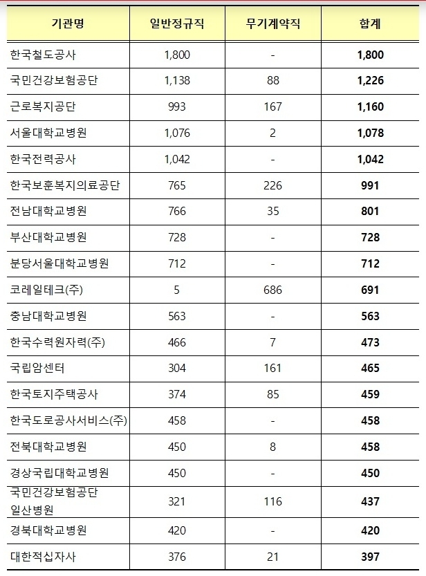 올해 채용 규모가 1000명 이상인 기관은 한국철도공사, 국민건강보험공단, 근로복지공단, 서울대학교병원, 한국전력공사 등이다.