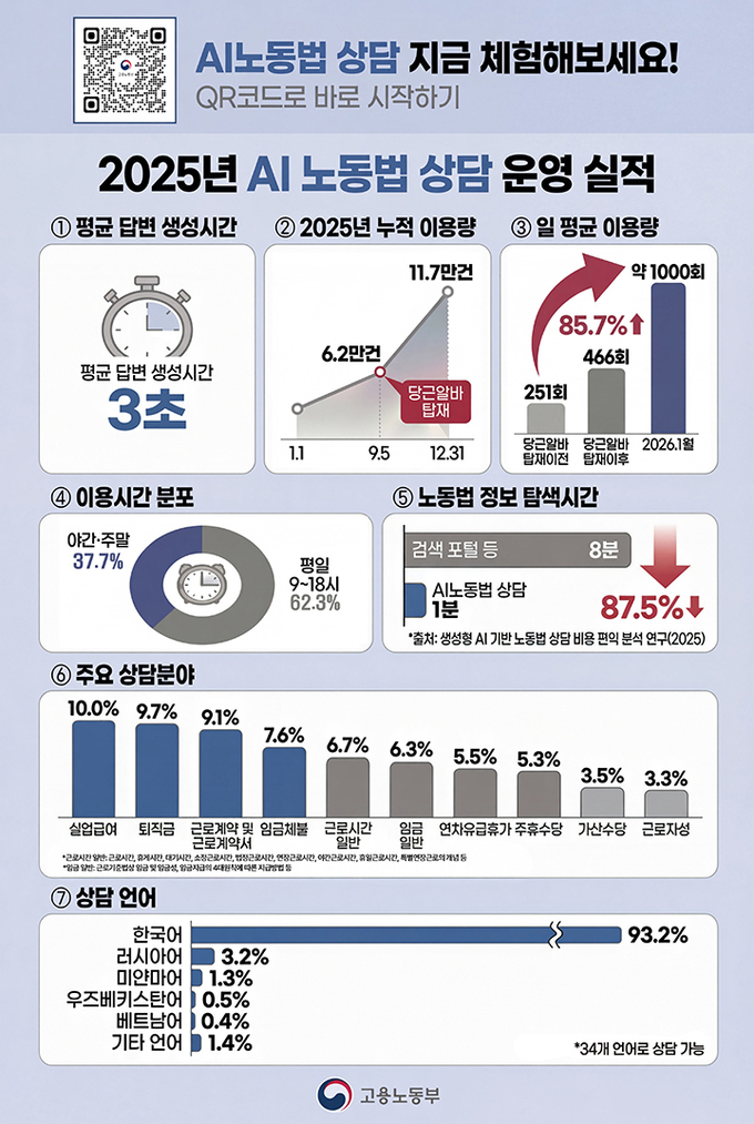 글로벌 서비스로서의 가능성도 확인했다. 전체 질의 중 외국어 비중은 6.8%로 언어 장벽 때문에 노동권 보호의 사각지대에 놓였던 외국인 근로자들에게 인공지능이 실시간 통번역가이자 법률 조력자 역할을 하고 있다.