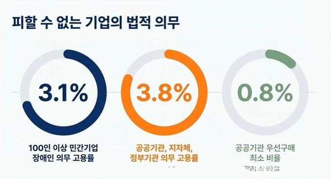 현행 장애인 고용촉진 및 직업재활법에 따르면 100인 이상 민간기업은 전체 직원의 3.1%를 장애인으로 고용해야 하며, 공공기관과 지자체는 3.8%의 의무고용률을 적용받는다. 이 비율은 향후 각각 3.5%, 4.0%까지 상향될 예정이다.