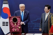 李대통령, 트럼프에 무궁화대훈장 수여...'천마총 금관 모형' 선물 도널드 트럼프 미국 대통령이 29일 오후 2시 13분, 한미 정상회담이 열리는 국립경주박물관에 도착했다. 트럼프 대통령이 탄 차량은 전통 취타대의 선도와 호위를 받으며 박물관으로 들어왔다. 이재명 대통령은 박물관의 천년미소관 앞에서 국빈으로 방한한 트럼프 대통령을 맞이했다. 이 대통령은 차량에서 내린 트럼프 대통령과 악수했고, 트럼프 대통령은 손으로 이 대통령의 어깨를 몇차례 치며 친근함을 표했다. 양국 정상은 천년미소관으로 함께 입장했다. 트럼프 대통령은 방명록 서명부터 했다. 양국 정상은 공식 환영식에서 의장대를 함께 사열했다. 이후 양국 참석자와 차례로 인사했다. 이재명 대통령은 공식 환영식에서 트럼프 대통령에 최고 훈장인 ‘무궁화 대훈장’을 수여했다. 트럼프 대통령은 미국 대통령으로는 처음 무궁화 대훈장을 받았다. 천마총 금관과 같은 모양의 금관도 선물했다. 트럼프 대통령은 “한국과의 관계를 계속 강화해나갈 것”이라고 말했다. 이재명 대통령과 트럼프 대통령은 공식 환영식에 이어 양국 정부 주요 관계자가 동석한 가운데 오찬을 겸한 회담을 진행했다. 이 대통령은 공식 환영식에서 트럼프 대
