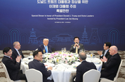 이재명 대통령이 29일 경북 경주 힐튼호텔 그랜드볼룸에서 열린 이 대통령 주최 정상 특별만찬에서 환영사를 하고 있다. 이재명 대통령 오른쪽 시계방향으로 르엉 끄엉 베트남 국가주석, 크리스토퍼 럭슨 뉴질랜드 총리, 마크 카니 캐나다 총리, 아누틴 찬위라꾼 태국 총리, 로런스 웡 싱가포르 총리, 앤서니 앨버니지 호주 총리. 도널드 트럼프 미국 대통령.